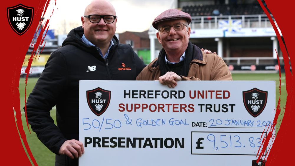 HUST continues to make monthly payments to HFC of the profits from the 50/50 Matchday Draw and Golden Goal and we dusted off our ‘Big Cheque’ in January, to do a celebration presentation at a chosen match.