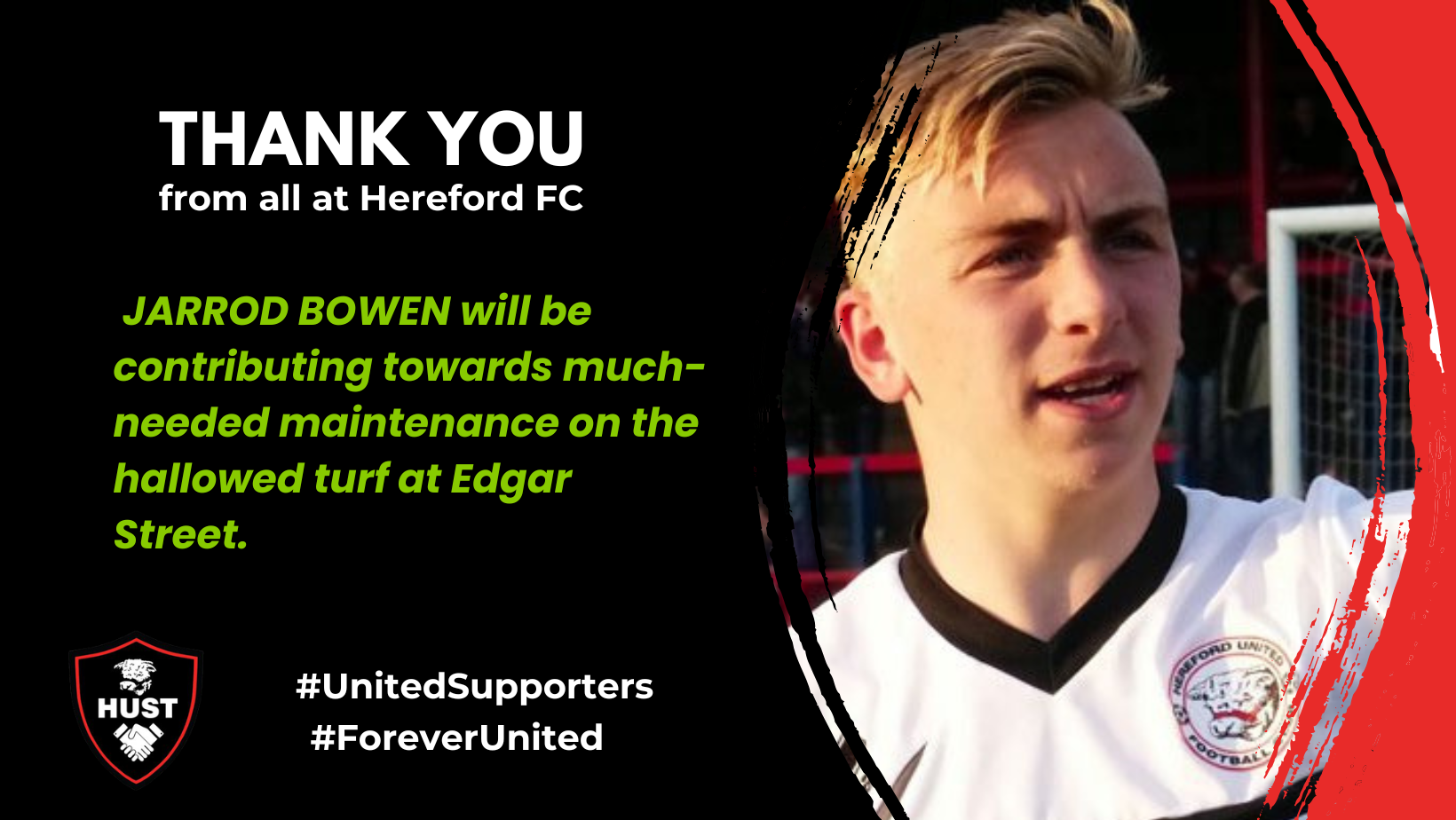 HUST acknowledges the splendid gesture from Jarrod Bowen to contribute to the close season pitch renovations, along with the founding shareholders. Jarrod needs no introduction to supporters, as his early playing days were at Hereford United. HUST chairman, Richard Tomkins says “Matchdays I often share a cup of tea in the volunteers’ room with Ben, our... Read More