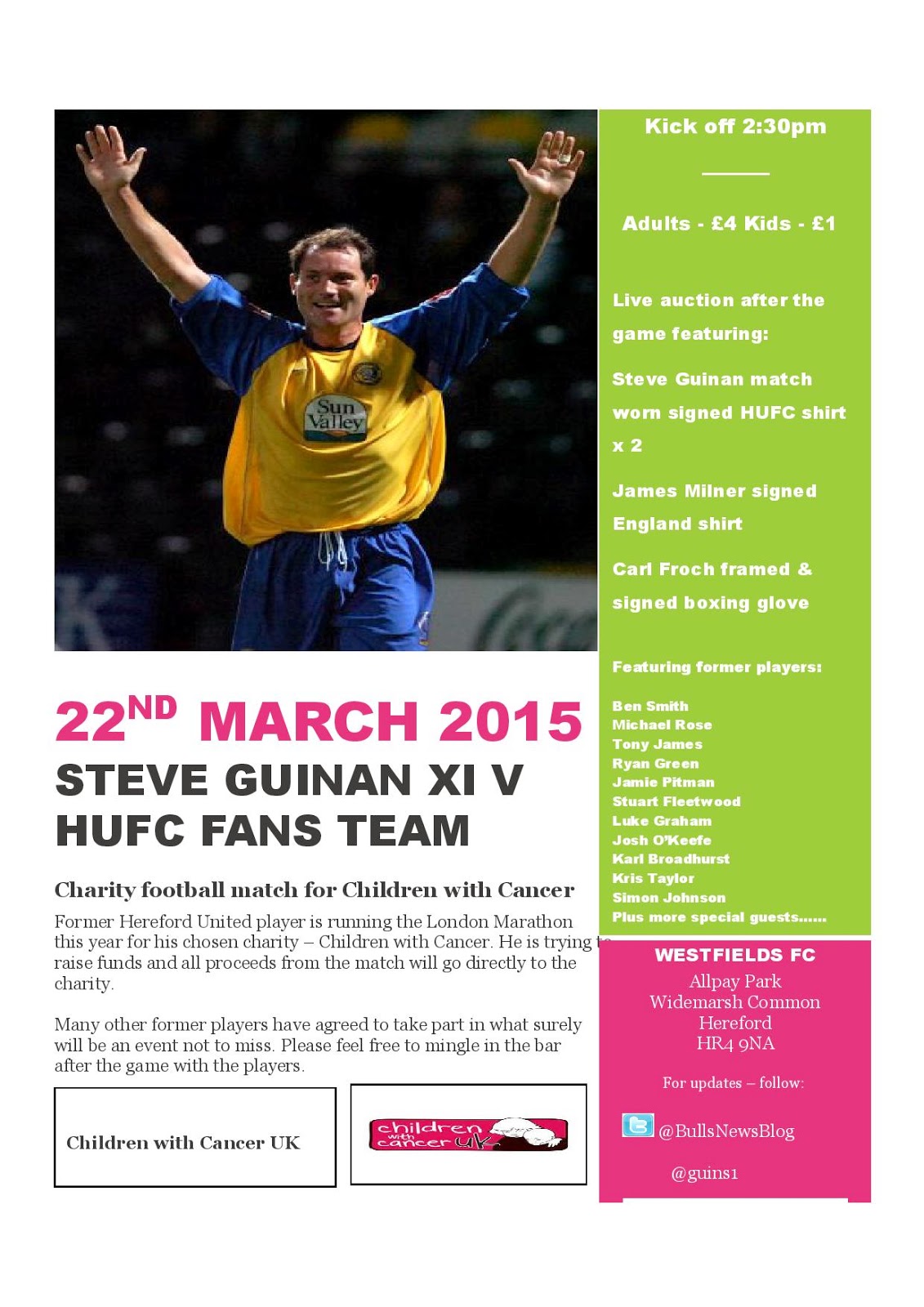 Ben Smith, Stuart Fleetwood, Luke Graham, and Josh O’Keefe have been added to the list of names appearing at Westfields on Sunday, March 22nd, for Steve Guinan’s charity fundraising game.